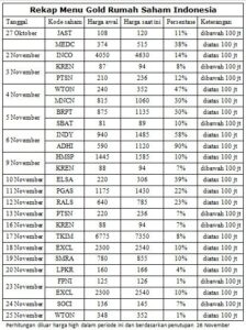 Bulan november ini banyak sekali saham yang bisa memberikan profit puluhan persen, diantaranya: LPPFINCOIMAS dll. Selain yang jadi menu  dari sebelum jam 8 pagi, juga banyak info jam bursa yang bisa puluhan persen dalam waktu tidak lama, seperti ENRGPPRO dll