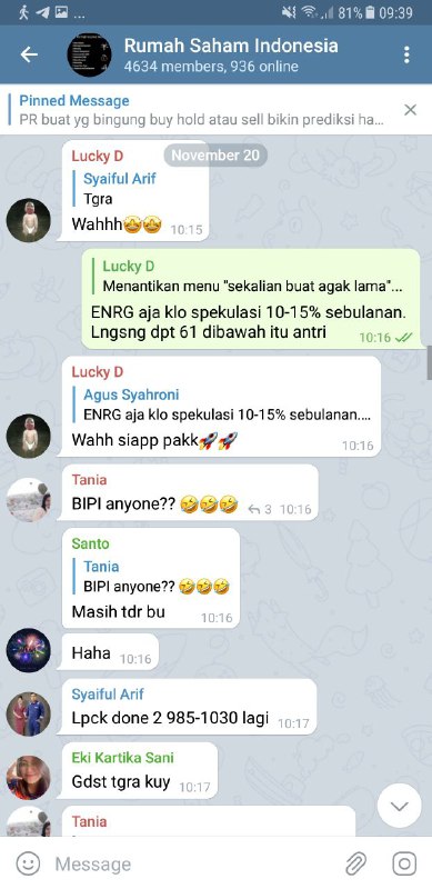 Bulan november ini banyak sekali saham yang bisa memberikan profit puluhan persen, diantaranya: LPPFINCOIMAS dll. Selain yang jadi menu  dari sebelum jam 8 pagi, juga banyak info jam bursa yang bisa puluhan persen dalam waktu tidak lama, seperti ENRGPPRO dll